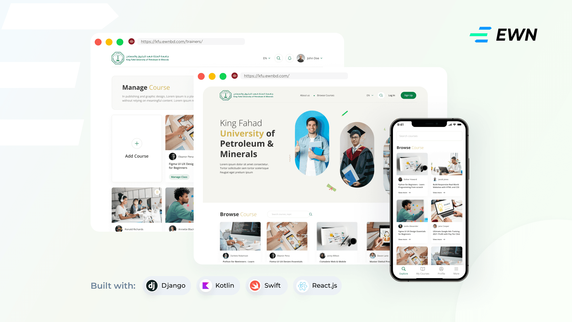 EWN Bangladesh Limited developed a comprehensive Learning Management System (LMS) for the Continuing Education Programs Center at King Fahad University, supporting both web and mobile access for trainees, trainers, organizations, and administrators. This platform facilitates streamlined course registration, management, and completion processes, enhancing user experiences through tailored interfaces and functionalities.